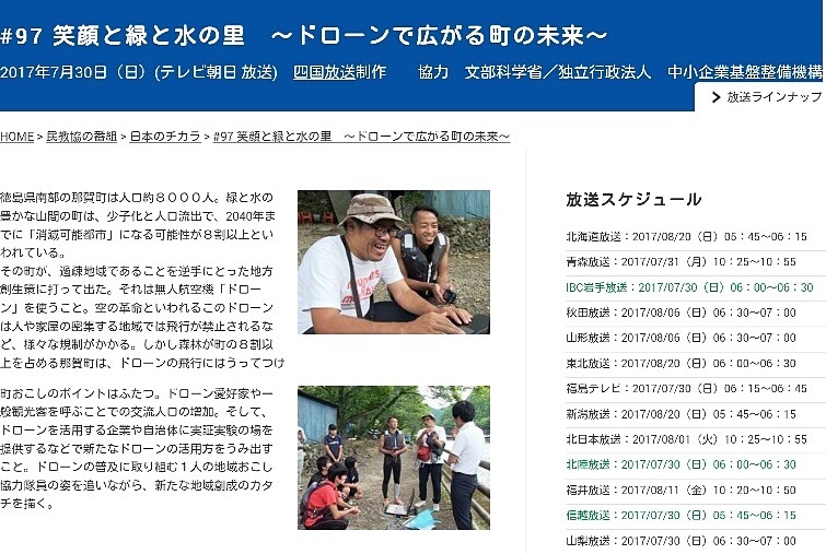 ドローンで地方創成活動している地域おこし協力隊喜多隊員と共に、木頭杉サップで徳島県那賀町のまちおこしに取り組む活動の模様が放送される模様です。